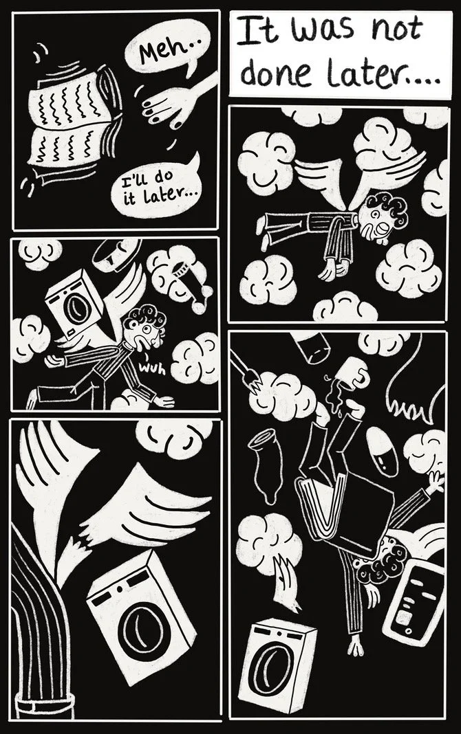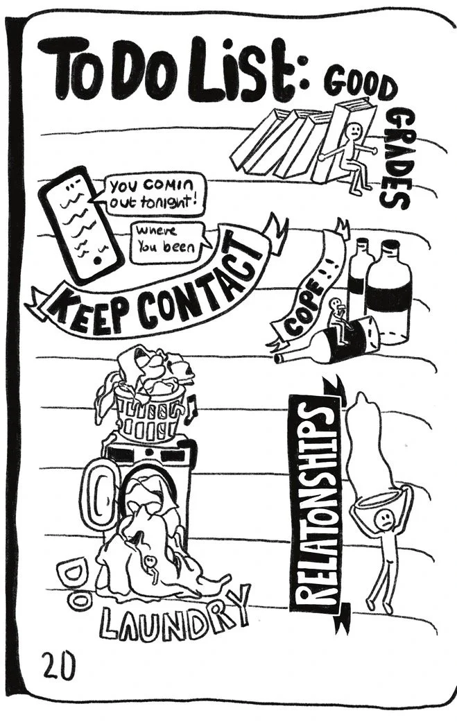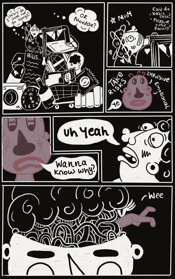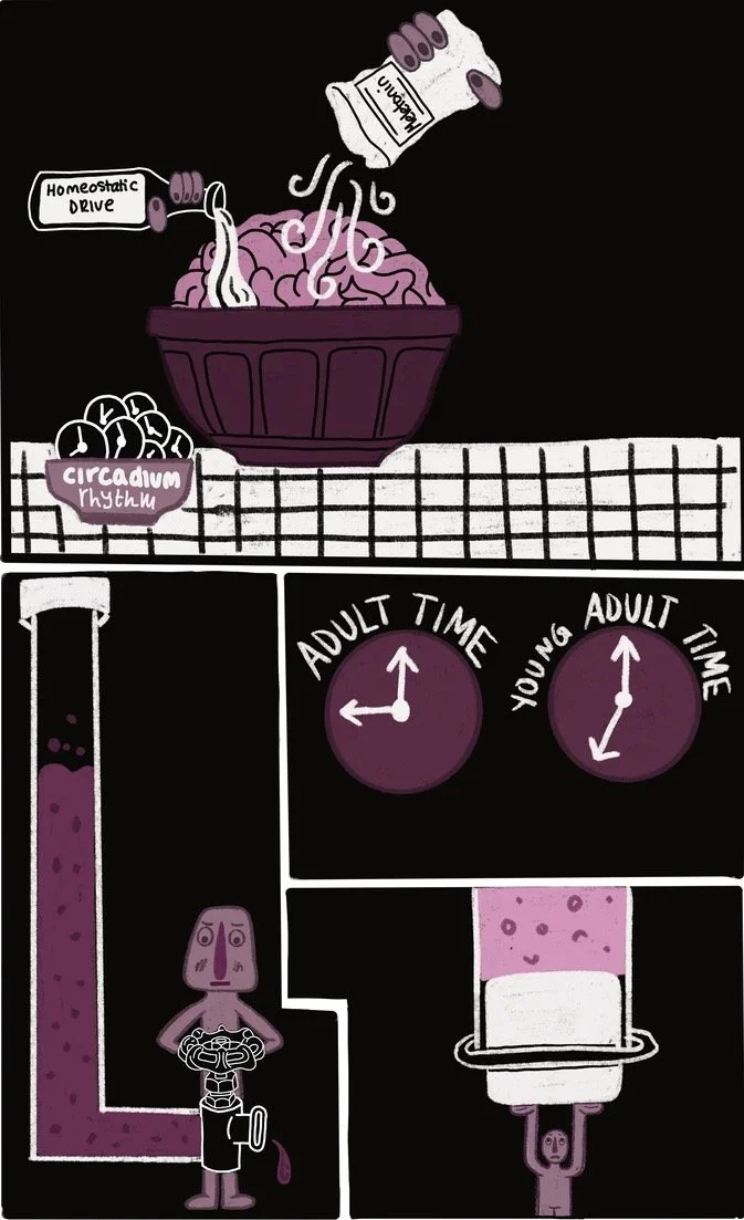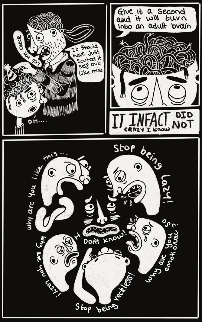 I created growing pains to make behavioural science more accessible to those outside of academia. This comic highlights stereotypical behaviour that is seen as negative in society that adolescents moving into young adulthood can't entirely control such as thrill seeking, tiredness and procrastination.